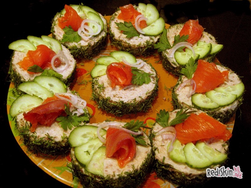 Печень трески с творогом. Яйца варят вкрутую, очищают, отделяют желтки. Творог, печень трески, желтки яиц, замоченную в воде и отжатую мякоть хлеба протирают через сито или пропускают через мясорубку с мелкой решеткой. Полученную массу тщательно взбивают, выкладывают в салатницу, украшают кружочками помидоров, мелко рубленной зеленью укропа и петрушки.