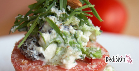 Помидоры фаршированные творожные с зеленым салатом. Листья салата тщательно промывают, обсушивают и сбрызгивают молочным соусом. Творог протирают, смешивают с молоком, нашинкованным зеленым луком, мелко нарубленной зеленью петрушки или укропа, солью, перцем. Помидоры нарезают кружками на 3 части, смазывают подготовленной творожной массой, соединяют части и укладывают на листья салата. К фаршированным помидорам отдельно подают соус молочный и нарезанный кусочками сыр.