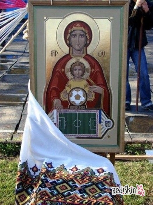 Не так давно на Украине священники грекокатолической церкви благословили икону, на которой изображена Богородица и Иисус, держащий в руках футбольный мяч. А внизу футбольное поле. Икона посвящается Евро-2012.